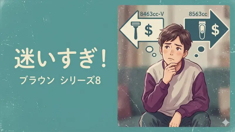 ブラウン シリーズ8の違いで迷っていませんか? 「8463cc-Vと8563ccって何が違うの?」「価格差13,000円って本当に価値あるの?」と悩んでいませんか。 ブラウンのシリーズ8はどちらも高性能ですが、違いが分かりにくく、なんとなくで選ぶと後悔しやすいモデルでもあります。 結論から言うと、この2つの違いはキワぞり性能の有無が大きなポイントです。 つまり、 ヒゲ剃りだけなら → 8463cc-Vで十分 もみあげ・うぶ毛も整えたい → 8563ccがおすすめ この記事では、スペックの違いだけでなく、あ ...