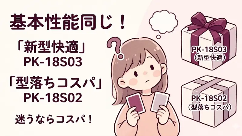 まず結論|どっちを選べば後悔しない? 「PK-18S03とPK-18S02、結局どっちを選べばいいの?」と迷っていませんか? 見た目はほとんど同じですが、実は細かな機能や使い勝手に違いがあります。 とはいえ、スペックだけを見ても「自分にとって必要かどうか」は判断しにくいですよね。 そこでこの記事では、違いをわかりやすく整理したうえで、あなたに合うモデルがすぐ判断できるように解説していきます。 まずは結論からお伝えします。 使い勝手や快適さを重視するなら「PK-18S03(新型)」 コスパ重視なら「PK-1 ...
