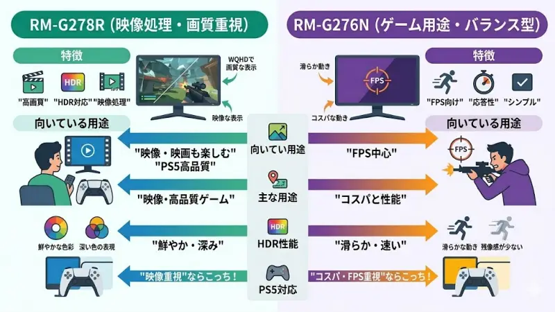 RM-G278RとRM-G276Nは同じ27インチクラスのゲーミングモニターですが、注目すべき違いは「画質処理」と「応答性のバランス」にあります。