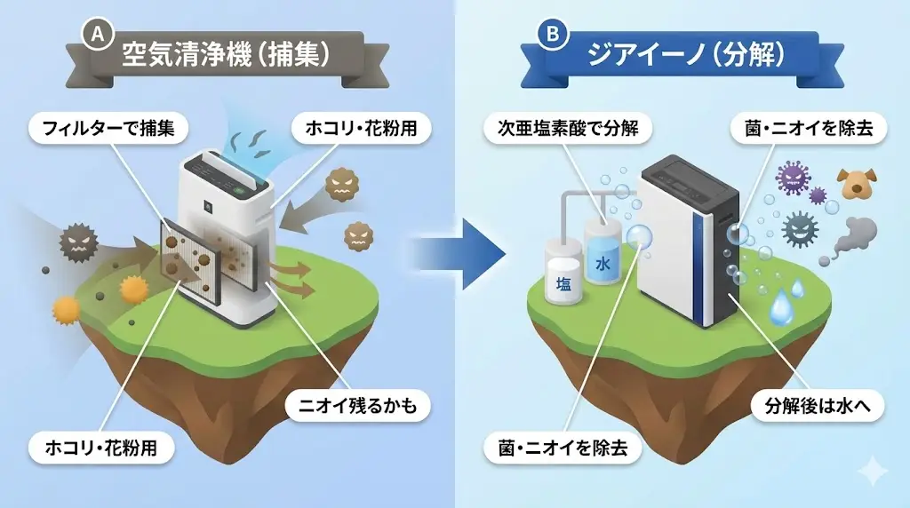 花粉やホコリ対策をメインに考えるなら空気清浄機、ニオイ・菌・ウイルス対策を重視するならジアイーノ、という使い分けがイメージしやすいです。