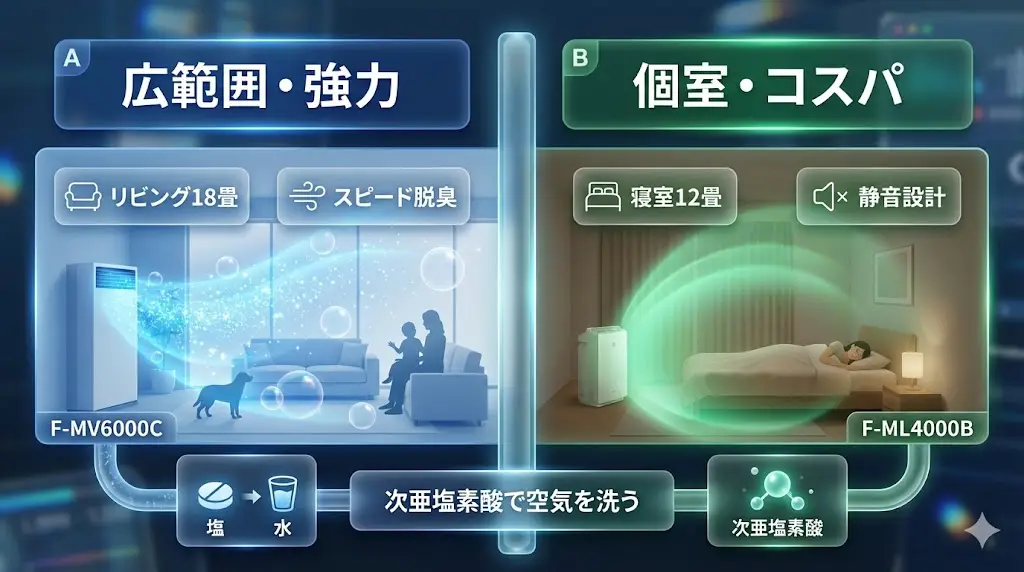 リビングやLDKなど広めの空間ではF-MV6000C、寝室・子ども部屋・ワンルームなどではF-ML4000Bが向いています。