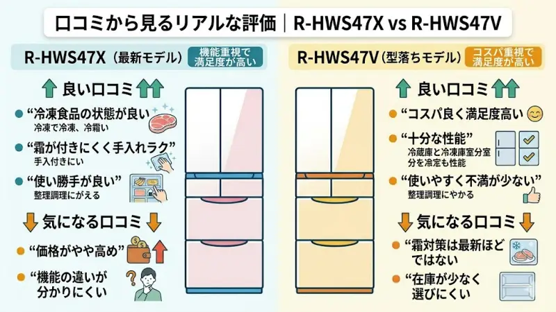 ここでは、R-HWS47XとR-HWS47Vそれぞれの口コミ傾向を整理してご紹介します。