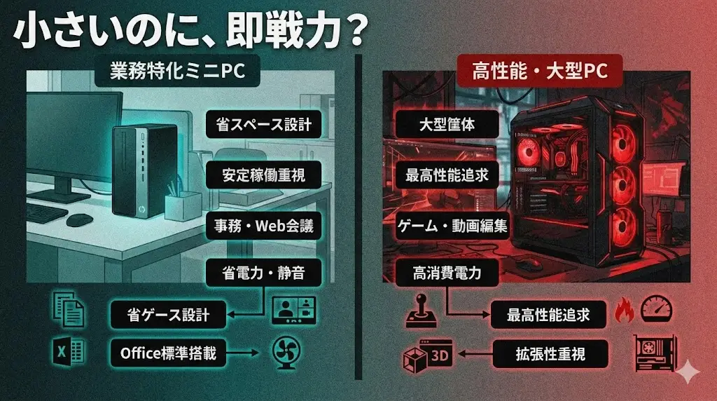 HP Pro Mini 400 G9とは?|法人向けミニデスクトップの定番モデル HP Pro Mini 400 G9は、法人・業務用途を前提に設計された省スペース型のミニデスクトップPCです。 一般的な家庭向けPCとは異なり、長時間の安定稼働や管理のしやすさを重視した構成となっており、 オフィスやSOHO、在宅ワーク環境での利用に向いています。 最大の特徴は、「省スペースでも安心して業務に使えること」。 筐体は非常にコンパクトで、デスク上はもちろん、棚の中やモニター背面など限られたスペースにも設置しやす ...
