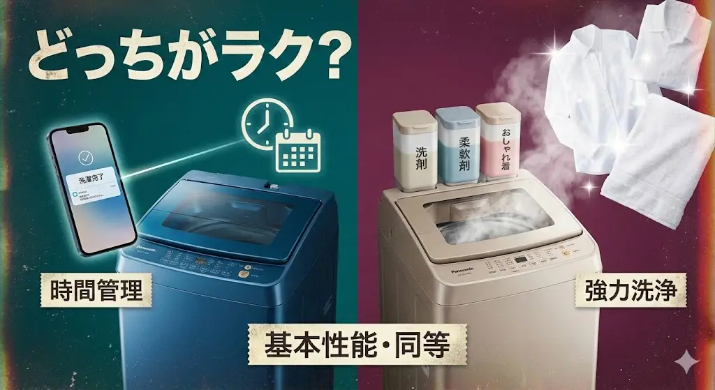「NA-SD10UBL」と「NA-SD10HBL」の違いを先に結論で解説 最初に結論からお伝えすると、2つのモデルは洗浄力やサイズといった基本性能は同じですが、重視する便利機能に違いがあります。 スマホ連携などのスマート機能を使って洗濯を管理したい方にはNA-SD10UBL、しつこい汚れをしっかり落としたい・洗剤投入の手間を減らしたい方にはNA-SD10HBLが向いています。 結論|スマート機能重視ならNA-SD10UBL、洗浄力重視ならNA-SD10HBL どちらもななめドラム洗濯乾燥機で、静音性や省ス ...
