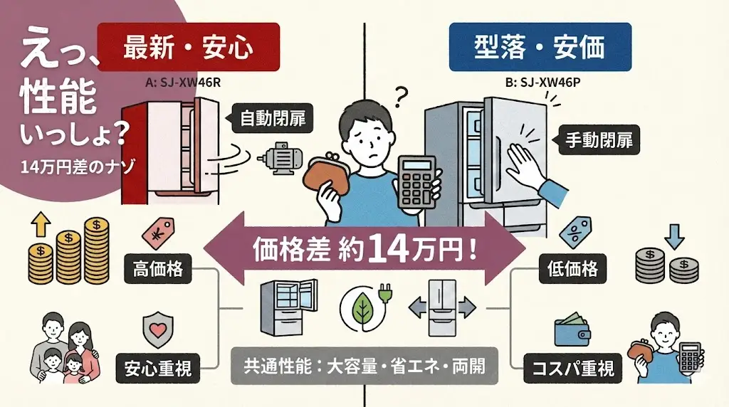 結論|SJ-XW46RとSJ-XW46Pの違いとおすすめはどっち? シャープの冷蔵庫「SJ-XW46R」と「SJ-XW46P」は、容量や基本性能はほぼ同じですが、 「オートクローズ機能の有無」と「価格差」が大きな判断ポイントになります。 そのため、どちらが優れているかというよりも、ライフスタイルや重視するポイントによっておすすめが分かれます。 まずは、それぞれどんな方に向いているのかを見ていきましょう。 SJ-XW46Rがおすすめな人 ドアの閉め忘れが気になる方 小さなお子さまがいて、冷蔵庫を開けっぱなし ...